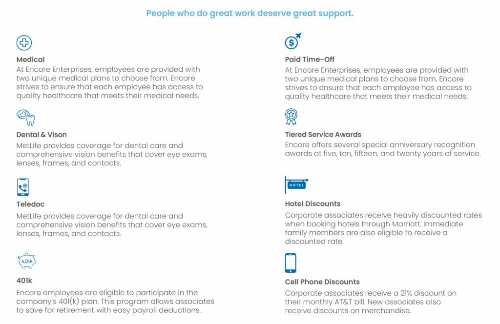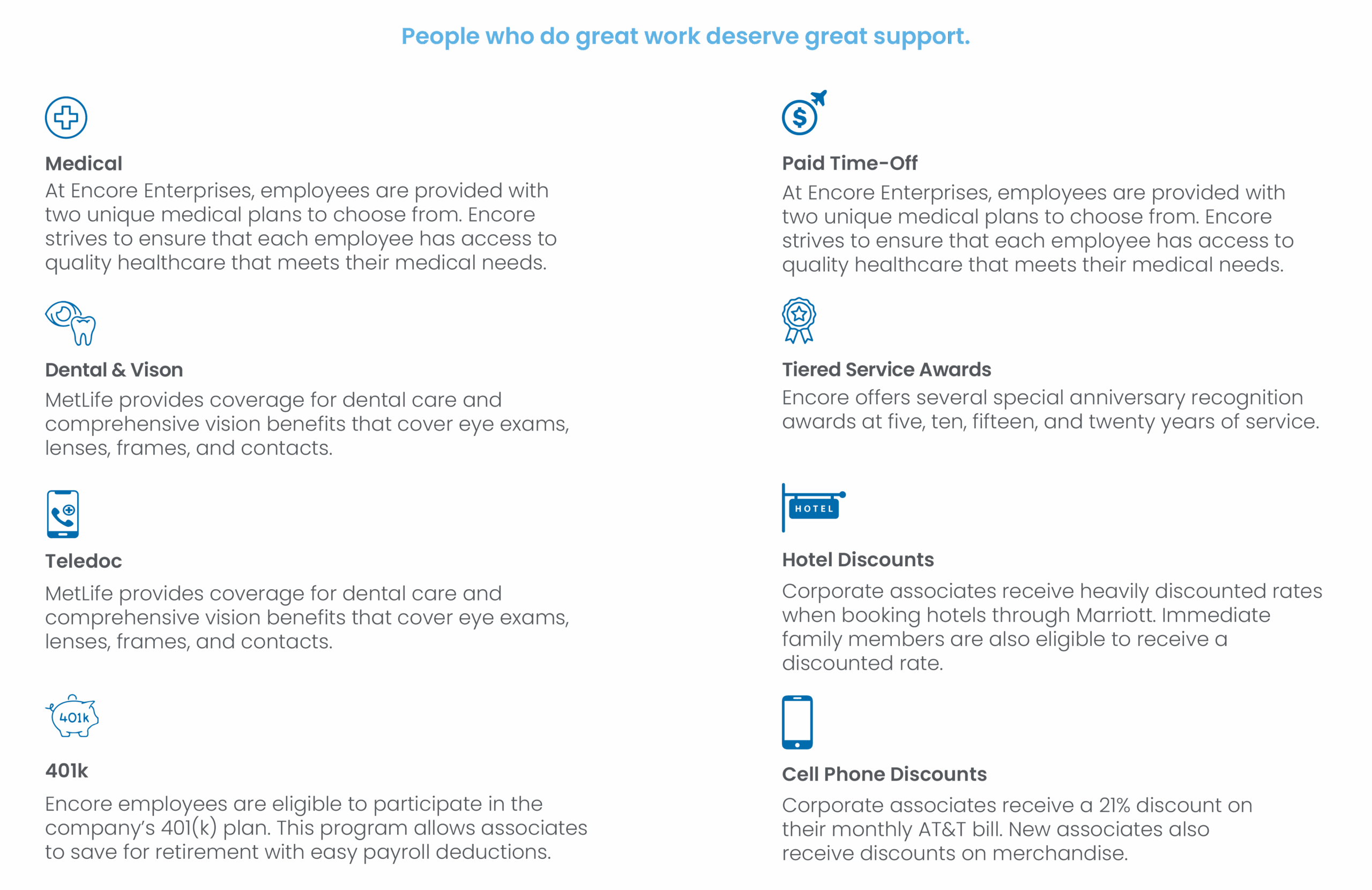 Encore takes pride in fostering a culture of effective management, teamwork, and dedication. For the last decade, our leaders have developed Encore’s culture into an atmosphere that allows new, innovative concepts to become a reality. Encore is an invigorating place to work that focuses on high performance and emphasizes integrity and diligence as part of good business practices. We always seek to attract new employees who have a vision, a passion, and a deep connection to their communities that they are happy to serve. Encore desires to bring in diverse, yet like-minded individuals who want to not only make a positive influence within the workplace but also within the community.